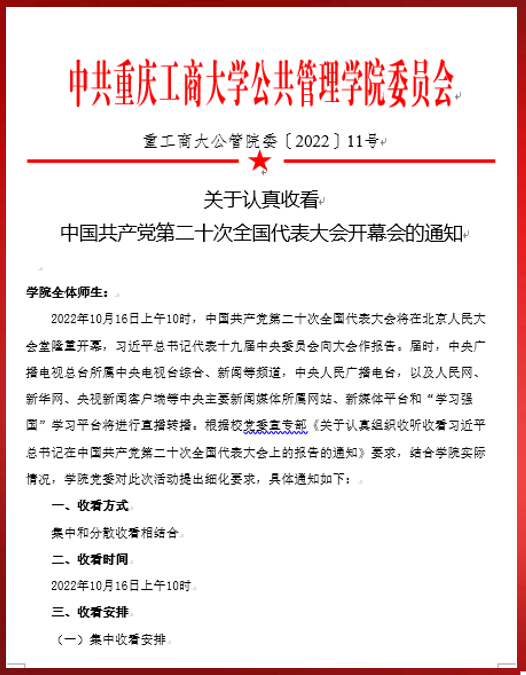 当前位置: 首页 >> 党建双创 >> 正文 【学习贯彻党的二十大精神】必赢242网址党委认真组织全院师生收看党的二十大开幕大会 时间:2022年10月16日 13:44 作者: 按照学院党委【2022】11号文件《关于认真收看中国共产党第二十次全国代表大会开幕会的通知》,2022年10月16日上午10时,中国共产党第二十次全国代表大会在人民大会堂隆重开幕,必赢242网址党委组织全院师生收听收看了党的二十大开幕大会。集中收看安排在学院启智楼81004会议室,党的二十大开幕会前,学院抗疫一线老师召开了会议,由学院党委书记彭勇同志主持,对学院组织收看党的二十大开幕会进行了布置,集中学习了党的二十大主要知识点。 在庄严肃穆的国歌声中,中国共产党第二十次代表大会正式开幕。在场的老师们认真聆听了习近平总书记在党的二十大中所作的报告,并不时在笔记本上做记录。集中收看结束后,现场老师们和分散收看的师生们纷纷表达了对二十大胜利召开的激动心情,并进行了热议。 教工二支部书记赵伟在支部群讨论中表示,报告明确提出全面推进乡村振兴,坚持农业农村优先发展,巩固拓展脱贫攻坚成果,加快建设农业强国,扎实推动乡村产业、人才、文化、生态、组织振兴,全方位夯实粮食安全根基,牢牢守住十八亿亩耕地红线,确保中国人的饭碗牢牢端在自己手中。这是守住总国人的饭碗、实施城乡融合发展、贯彻落实生态文明建设的重要举措。 学生一党支部书记郭爽表示,作为一名高校辅导员,我们要根据中央和上级的要求,认真落实学习宣传贯彻党的二十大精神的工作,通过各种方式,迅速掀起学习宣讲宣传贯彻党的二十大精神的热潮。 19级社保一班预备党员任瑶同学表示,我悉数聆听着在党的带领下我们悄然发生的历史巨变,更加深入体会到了党的领导是中国特色社会主义制度的最大优势!犹记得习近平总书记勉励我们青年“在报效祖国的过程中成长成才”,教导我们青年“成才之路就在脚下,靠我们自己走”。党所带领我们创造的丰功伟绩,一定会鼓励我们在前进道路上的青年,坚定不移跟党走,努力学习,拼搏奋进,报效祖国,以饱满的热情不断书写新时代中国特色社会主义新篇章。 集中收看结束后,彭勇同志强调,学院党委一定要按照中央和上级的要求,进一步统一思想,充分认识学习宣传贯彻党的二十大精神的重大意义,把全院师生员工的思想和行动统一到党的二十大精神上来;要认真学习,深刻领会准确把握党的二十大的基本精神;要认真组织,在全院迅速掀起学习宣传贯彻党的二十大精神的高潮。 上一条:【“疫”路同心,一路同行】带着点点微光,向阳而行——记公管院最美楼栋志愿者 下一条:【“疫”路同心,一路同行】“疫”路同心,夫妻同行——记院级志愿者毛小娟和校级志愿者胡磊一家 【关闭】