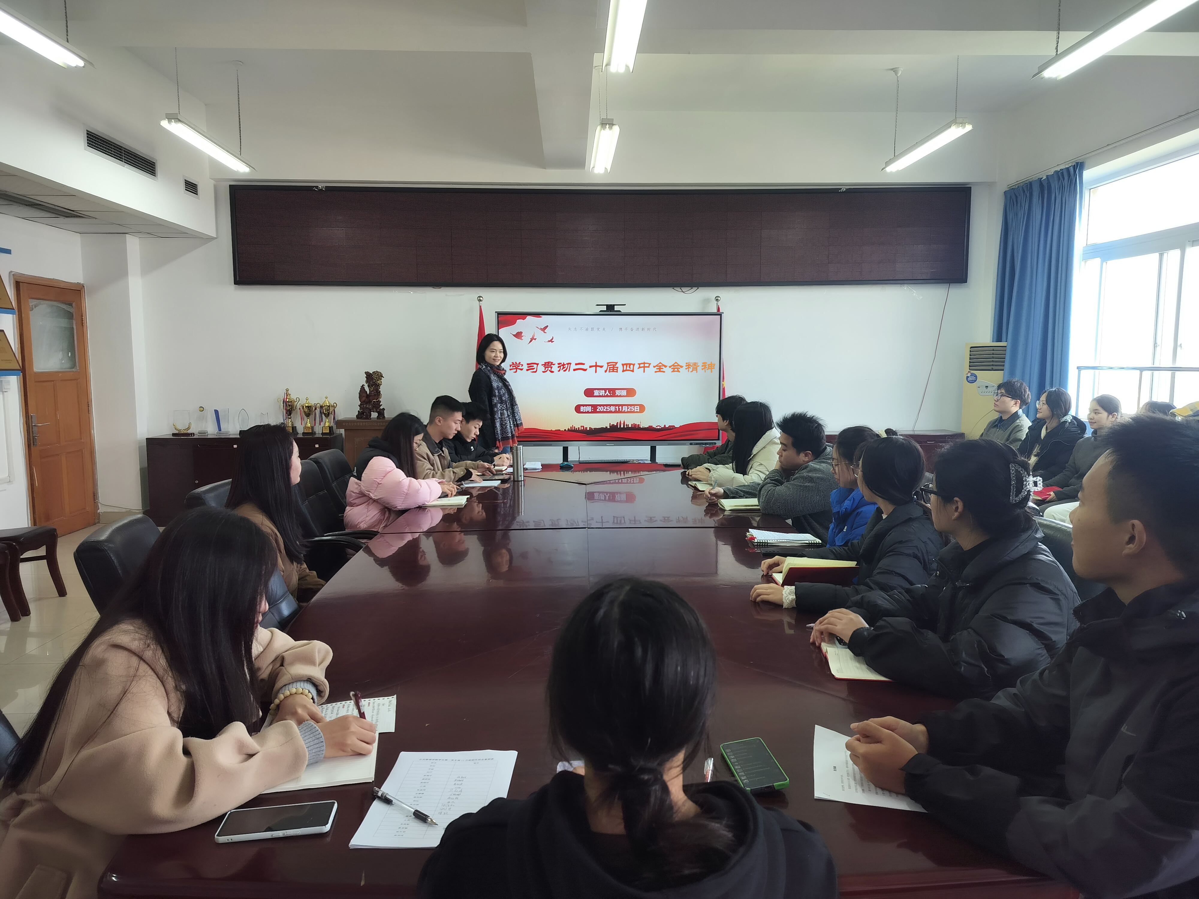 当前位置: 首页 >> 党建双创 >> 主题教育 >> 正文 【党课开讲啦】凝聚青年力量 践行使命担当 ——必赢242网址学生第二党支部举办党的二十届四中全会精神专题学习会 时间:2025年11月25日 15:30 作者: 蒋杰 为深入学习贯彻党的二十届四中全会精神,引领青年党员建功新时代,2025年11月25日,必赢242网址学生第二党支部举办专题学习会。本次学习会由支部宣传委员、学院分团委书记邓丽担任主讲,支部全体学生党员参与学习。 邓丽立足公共管理专业特色,从青年学生的视角出发,对全会精神进行了生动解读。她重点分析了“国家治理现代化与青年使命”的内在联系,指出新时代学生党员要主动将个人成长融入国家发展大局,在专业学习与社会实践中提升综合能力,争做懂治理、善服务、勇担当的先锋力量。 结合共青团工作和学生党员培养实际,邓丽提出三点期望:一要筑牢信仰根基,做理论学习的先行者,持续深化对全会精神的理解把握;二要练就过硬本领,做知行合一的实干家,努力成为推进国家治理现代化的后备军;三要勇担时代重任,做服务奉献的排头兵,在志愿服务、基层治理等实践中展现青年党员的担当。 学习会现场气氛活跃,互动热烈。与会党员纷纷表示,此次宣讲内容贴近青年实际,语言生动鲜活,既有思想引领,又有实践指导。通过深入学习,进一步明确了自身肩负的责任,将牢记嘱托、砥砺奋进,把学习成果转化为推动学业进步和参与社会服务的实际行动,为实现中华民族伟大复兴贡献青春智慧与力量。 上一条:必赢242网址党委书记陆嘉宣讲党的二十届四中全会精神 下一条:学院党委理论学习中心组集中学习贯彻党的二十届四中全会精神 【关闭】