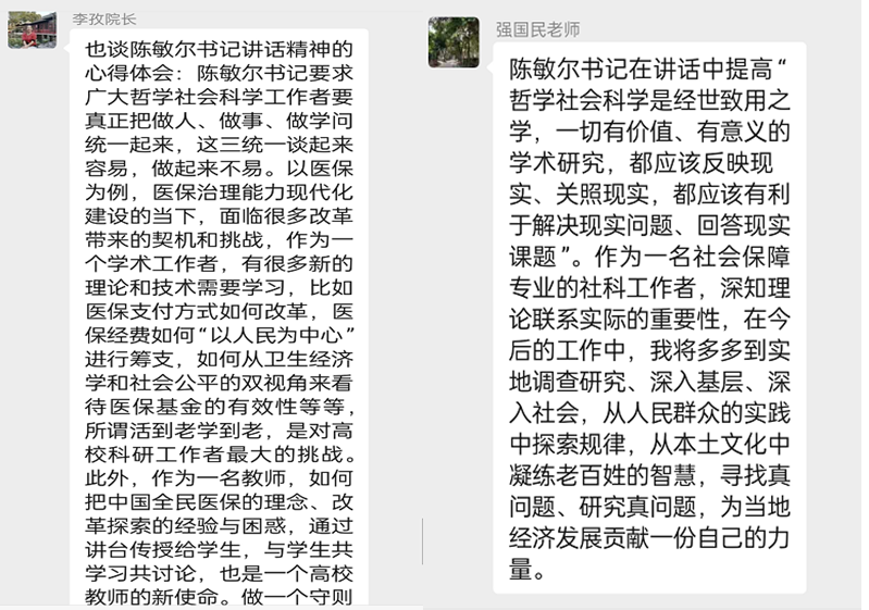 当前位置: 首页 >> 科学研究 >> 正文 必赢242网址党委组织学院教师学习陈敏尔书记在重庆市社科联第五次代表大会开幕式上的讲话精神 时间:2022年04月27日 10:23 作者: 2022年4月12日,陈敏尔书记在重庆市社会科学界联合会第五次代表大会开幕式上发表讲话。他强调指出,要深入学习贯彻习近平总书记关于哲学社会科学的重要论述,始终牢记初心使命,发扬历史主动精神,高举旗帜凝心聚力,围绕中心服务大局,立足实际守正创新,推动哲学社会科学事业大发展大繁荣,为全市人民奋进新征程、建功新时代提供强大的精神动力、理论支撑和智力支持,以优异成绩迎接党的二十大胜利召开。 4月22日,必赢242网址党委积极响应,组织全院教师认真学习了陈敏尔书记的讲话,讲话在学院老师中引起热烈反响和讨论,教师们纷纷表示倍感振奋、深受鼓舞。会后,学院科研平台人员开展了线上学习交流,并展开了热烈讨论。他们就“围绕中心、服务大局”“立足实际、守正创新”以及“做大学问、做真学问、做好学问”等内容纷纷撰写心得体会,畅谈学习认识感悟。 山区土地利用监测与规划管理研究中心主任、巴渝青年学者王兆林教授:通过学习陈敏尔在市社会科学界联合会第五次代表大会开幕式上的讲话精神,我们要自觉做习近平新时代中国特色社会主义思想的信仰者、追随者、践行者,不断增强政治认同、思想认同、情感认同,加强理论武装,深化研究阐释,做好宣传普及。平台工作要围绕中心、服务大局,为全市经济社会发展献良计出高招。要紧扣习近平总书记对重庆所作重要讲话和系列重要指示批示精神,坚持以人民为中心的研究导向,树立鲜明问题导向,加强全局性、战略性、前瞻性研究,拿出一批具有思想分量、对策质量、价值含量的研究成果,真正把论文写在重庆大地上,把学问写进群众心坎里。 医保治理能力现代化研究院副主任、青年教师吴香雪博士:陈敏尔书记要求广大哲学社会科学工作者要真正把做人、做事、做学问统一起来,立志做大学问、做真学问、做好学问,在为祖国、为人民立德立言中成就自我、实现价值。我所在的专业社会保障是国家的一项社会基本制度,是国家治理之“重器”,是“以人民为中心”的伟大实践。作为广大的青年社保学者群体的一份子,愿意做理论和政策的桥梁,愿意做研究和现实的桥梁,愿意做学界和决策者的桥梁,坚持问题导向,坚持研究的主体性和原创性,立学为民,治学报国。 人口发展与政策研究中心副主任、青年教师薛晓博士:做科研,需要立足实际,守正创新。作为科研工作者,既要踏踏实实遵循研究对象本身的客观规律,也要敢想、敢验证,去突破一些旧有的思想和意识,大胆突破条条框框的限制。 张欣博士:学习了陈敏尔书记在重庆市社会科学界联合会第五次代表大会开幕式上发表讲话,作为一线的教师,我们应该为“落地”的教学科研作积极准备,进而切实行动起来,将教学科研变成老师们的幸福栖居。以“课”为例,我们首先要课前认真“做课”,给自己一种价值感和期待感;其次,课中从容“上课”,还自己一份获得感和幸福感;再次,课后充分“议课”,给大家一种代入感和归属感;最后,要在科研与教学中挖掘好、保护好、传承好、发展好、创新好、宣传好重庆独特而厚重的历史文化资源,真正把论文写在重庆大地上,把学问写进学生心坎里,发出重庆好声音、展示重庆新形象,有力助推重庆经济社会发展,以优异成绩迎接党的二十大和市第六次党代会胜利召开。 夏涛博士:社会科学研究要牢牢把握正确的政治方向,要始终坚持以习近平新时代中国特色社会主义思想为指引;社会科学研究要立足解决经济社会发展的现实问题,力争为重庆市的发展贡献绵薄之力。 刘晓君博士:学哲学,爱哲学。陈敏尔书记在重庆市社会科学界联合会第五次代表大会开幕式上的讲话另我等备受鼓舞。我们可以看到重庆市在繁荣哲学社会科学上所取得的可喜成果。未来,我们也将继续脚踏实地,为全市经济社会发展建言献策。 谭江蓉博士:学习了陈敏尔书记在重庆市社会科学界联合会第五次代表大会开幕式上的讲话之后,作为高校的一名哲学社会科学工作者,受益良多。以习近平同志为核心的党中央高度重视哲学社会科学发展,明确了加快构建中国特色哲学社会科学的战略任务,开启了我国哲学社会科学繁荣发展的新征程。我们应该认真学习贯彻总书记关于哲学社会科学的重要论述,始终坚持与时代同进步、与实践共发展,做学问出精品,树新风育人才。 何增华博士:在科学研究与教学过程中,要始终坚持实际问题为导向,关注并切实解决重庆实际问题。尤其是在科研工作中,要因地制宜、深入群众,扎根重庆大地实践,努力将社科研究成果转化为现实生产力,真正将论文写在重庆大地上。 通过此次学习,学院教师增强了对哲学社会科学的认识。学院也将在今后的科研实践中,认真贯彻学习陈敏尔书记的讲话精神,努力推进学院科研的高质量发展。 上一条:必赢242网址召开2023年度秋季学期科研工作专题会 下一条:公共管理大讲堂(迎70周年校庆特别讲座)——双碳治理与国土空间规划创新 【关闭】