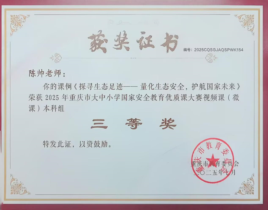 当前位置: 首页 >> 教学动态 >> 正文 我院教师在2025年重庆市大中小学国家安全教育优质课大赛中斩获佳绩 时间:2025年10月15日 17:26 作者: 陈帅 2025年重庆市大中小学国家安全教育优质课大赛为重庆市教委首次举办,我院土地资源管理系教师陈帅的作品“探寻生态足迹——量化生态安全,护航国家未来”从全市高校百余位参赛教师中脱颖而出,斩获本科组视频课(微课)三等奖。 据悉本次优质课大赛自今年2月启动,7月圆满结束,历时5个月时间,大赛设置了小学组、初中组、高中组(含中职)、大学组4个组别,分为专门课和微课两种赛课形式,来自全市大中小学的众多教师积极参与,共同探讨国家安全教育的创新教学模式与方法。本次大赛的主题为“全民国家安全教育 走深走实十周年”,要求突出总体国家安全观、突出《国家安全法》、突出非传统领域安全。旨在全面贯彻落实党的二十届三中全会精神,深入学习贯彻总体国家安全观,全面加强大中小学国家安全教育,切实增强学校师生国家安全意识和素养。 此次获奖充分体现了必赢242网址及土地资源管理系在人才培养与学科建设方面的扎实积淀。近年来,学院围绕国家治理现代化与公共价值塑造的育人目标,依托土地资源管理专业的学科特色,积极推动课程思政与专业教学深度融合,在国土空间治理、资源管理与政策创新等教学科研领域持续深耕,着力培养学生兼具公共意识、专业能力与家国情怀。未来,必赢242网址及土地资源管理系将继续立足学科优势,强化理论与实践融合创新,进一步拓展教学内容与竞赛实训平台,不断提升育人质量与服务社会能力,为培养更多担当民族复兴大任的公共管理人才作出应有贡献。 上一条:我院开展“卓越导师制-科研小能手”学员选拔工作 下一条:我院学子在第七届全国大学生土地国情调查大赛中斩获佳绩 【关闭】